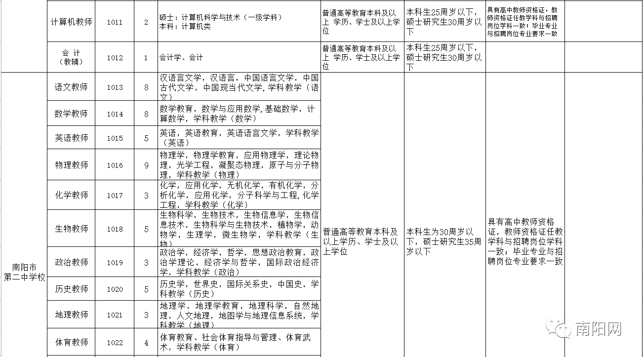 七、纪律与监督1、实行回避制度。凡参与本次公开招聘的工作人员,按有关规定一律实行回避制度。2、严格纪律。在本次招聘工作中要严格执行有关纪律要求,如发现有违纪违规行为,将严格按照有关规定进行处理。要做到信息公开、过程公开、结果公开,接受社会及有关部门的监督。八、疫情防控在招考组织实施过程中,根据疫情防控动态要求,严格落实防疫措施。必要时,将随时对有关工作安排进行适当调整。应试者有义务随时关注本次公开招聘考试专用网站,按要求提前做好各项准备工作,如实提供有关信息,服从现场管理,接受健康码查验及体温测量等。不符合疫情防控要求的,不得参加考试、体检。 九、其它事项(一)南阳市人社局网站、南阳市人事考试网和南阳市教育局网站为本次市直学校公开招聘工作的专用网站,有关考试招聘的信息及相关事项,均通过该网站进行发布,不再单独通知考生本人,请考生随时关注网站信息。凡各环节未按有关通知要求执行的考生,视为自动弃权。(二)报考者提交的信息和提供的有关证件、材料必须真实有效,资格审查贯穿公开招聘工作全过程,凡发现报考者与拟聘用岗位所要求的资格条件不符以及提供虚假材料的,取消其考试、聘用资格。在职人员报考前需经原单位同意。(三)本次考试不指定考试辅导用书,不举办也不委托任何机构举办考试辅导培训班。2021年市直学校公开招聘岗位及其资格条件一览表