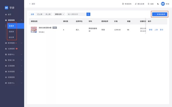 在“学浪老师版”的操作后台,除了直播教室之外,还有招生转化、班级管理、学员沟通等工具与服务,从而使得知识传播者得以在一个平台实现课程沉淀、账号运营、直播运营等。
