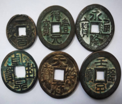 打开父亲的布包还是那6枚古旧钱币,不知是什么年代的“天策府宝”、“得壹元宝”、“永安一百”、“乹封泉宝”、“壬子通宝”、“永隆通宝”都是大小不一的圆形方孔钱(豫东叫:皮钱子、铜钱),望着这些古钱币,能传到我手上,也是一种缘。