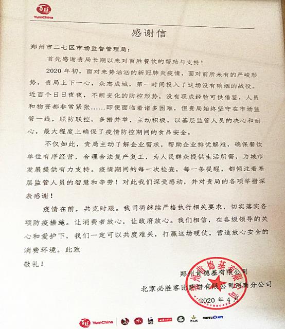 “主动了解企业需求,帮助企业排忧解难,确保餐饮企业合法经营,有序复工复产,为人民群众提供生活所需,为城市发展提供有力支持。疫情期间的每一次检查,每一次提醒,都倾注着基层监管人员的智慧和辛劳!对此,我们深受感动,并对贵局的各项举措深表感谢!”这是郑州肯德基有限公司写给郑州市二七区市场监管局的感谢信。