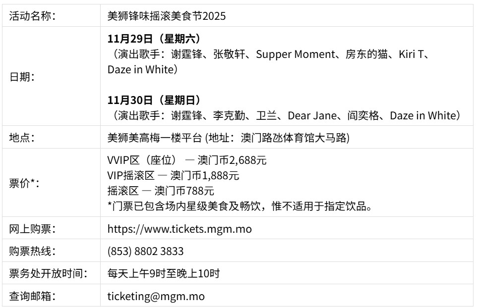 “美狮锋味摇滚美食节2025”将于11月29至30日在美狮美高梅一楼平台举行,门票由10月14日起于美高梅官网、大麦网、携程旅游、猫眼公开发售,票价由澳门币788元起。有关票务以及更多活动详情,请浏览美高梅官方网页 https://www.mgm.mo/zh-hant/cotai/entertainment/chefnic2025。