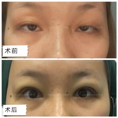 上眼睑轻度下垂,左侧比右侧稍重,双上睑重睑肿厚,形态不对称,眼尾垂吊,上眶区凹陷