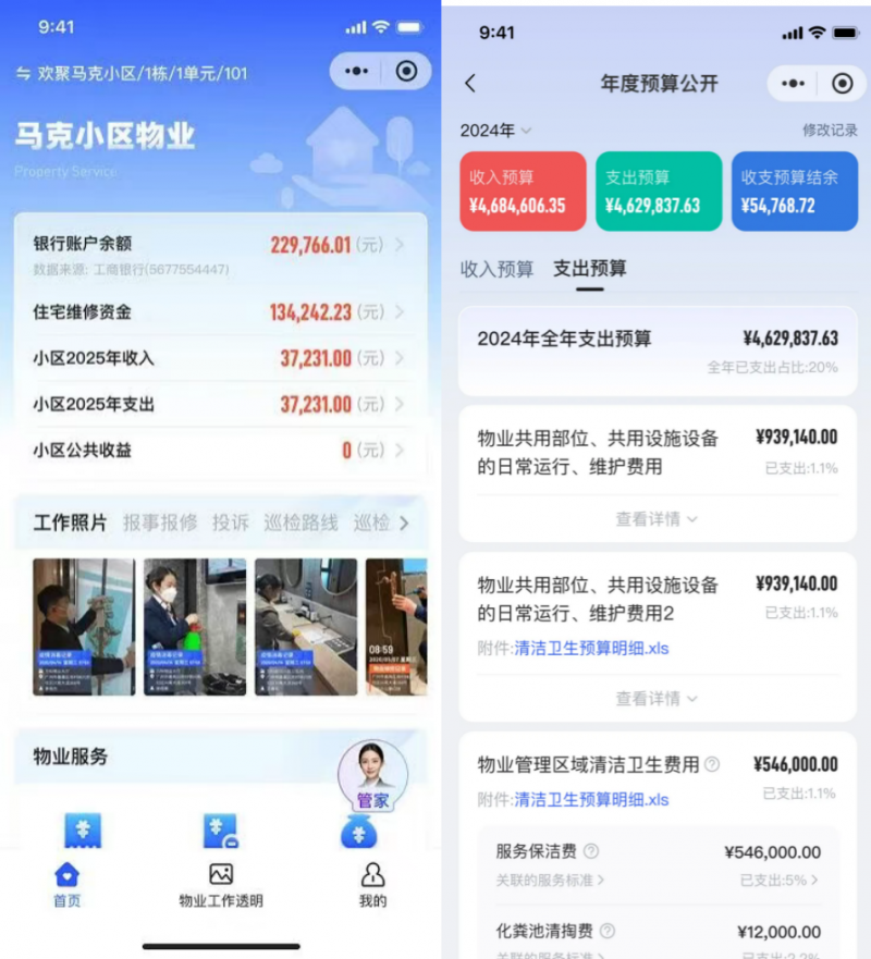 据悉,“马克透明小区”服务平台成功打通银行流水账户通道,业主只需通过小程序即可一站式查阅小区财务支出明细、公共收益、年度预算、服务标准合同、维修基金使用及缴费情况等关键信息,真正实现小区治理全流程可视化、可追溯。