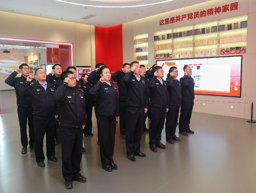 “我志愿加入中国共产党,拥护党的纲领,遵守党的章程......”在谱系馆鲜红的党旗前,全体党员民警昂首肃立、举起右拳,在王磊总队长的领誓下,以铿锵有力的誓言重温入党时的庄严承诺。铮铮誓言回荡在展馆之中,既是对革命先辈的深情告慰,也是对新时代新使命的郑重担当,更坚定了全体党员民警“对党忠诚、服务人民、执法公正、纪律严明”的政治信念。