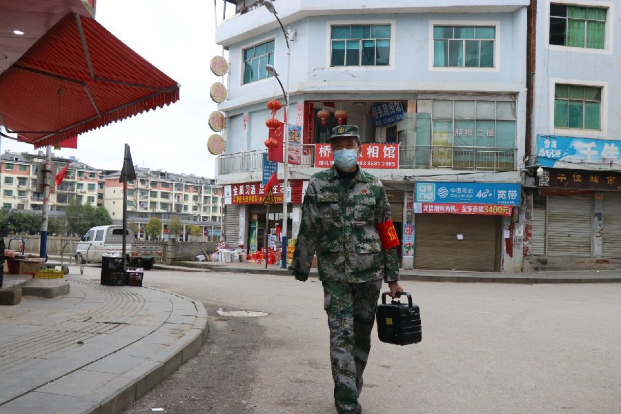 当天,像丁振河这样主动请缨的党员和退伍军人有14名,由于他们大多是退伍军人,羊坪镇政府临时组建了一支抗疫民兵突击队,他们统一身着迷彩服、戴着军帽、佩戴执勤牌每天早晚在集镇开展日常巡逻、疫情知识宣传、注意事项提醒、协助社区排查、疫情卡点值班值守等工作。