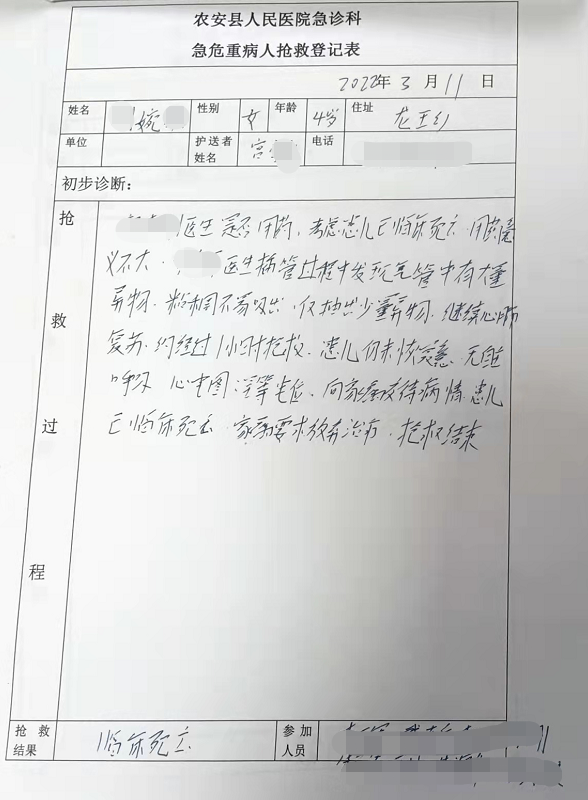农安县人民医院急诊科急危重病人抢救登记表显示:「经询问家属,患儿为喉炎患者,已办完住院手续,在过渡病房过程中发病。」