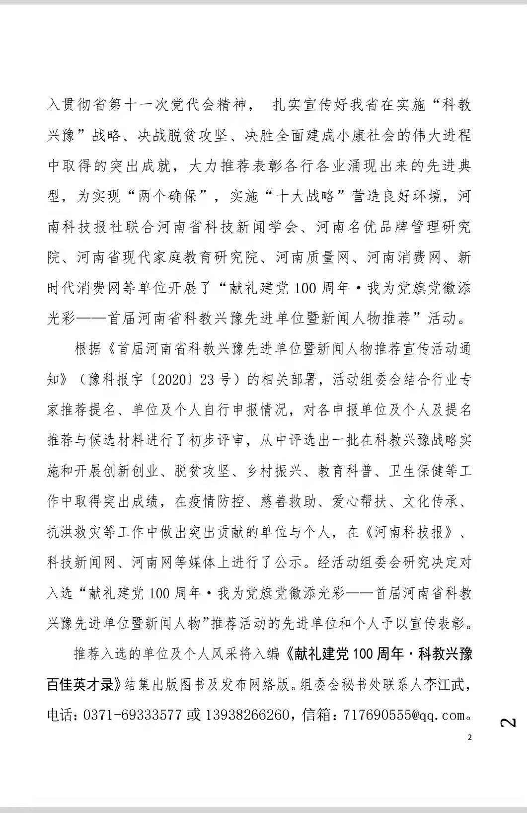 根据《首届河南省科教兴豫先进单位暨新闻人物推荐宣传活动通知》(豫科报字〔2020〕23号)的相关部署,活动组委会结合行业专家推荐提名、单位及个人自行申报情况,对各申报单位及个人的候选材料进行了初步评审,从中评选出一批在科教兴豫战略实施和开展创新创业、脱贫攻坚、乡村振兴等工作中取得突出成绩,在疫情防控、慈善救助、爱心帮扶、文化传承、抗洪救灾等工作中做出突出贡献的单位与个人,2021年6月29日~7月10日在《河南科技报》、科技新闻网、河南网、腾讯网等媒体上进行了公示。2021年12月21日经活动组委会研究决定在《河南科技报》官方媒体“科技新闻网”及河南网等媒体科技对入选“献礼建党100周年·我为党旗党徽添光彩——首届河南省科教兴豫先进单位暨新闻人物”推荐活动的先进单位和个人予以推荐宣传(公告)(豫科报字〔2021〕53号)。