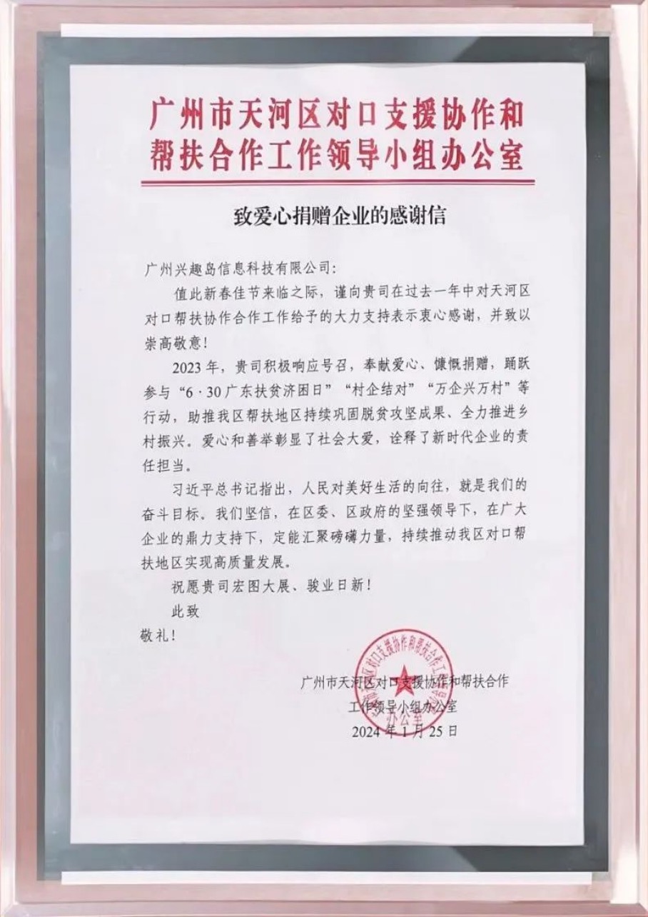 广州市天河区对口支援协作和帮扶合作工作领导小组办公室的感谢信