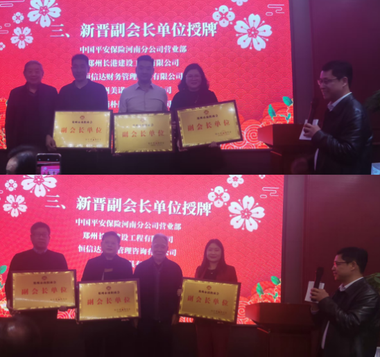 为表彰先进、壮大组织,会议举行了新晋副会长单位授牌仪式。在热烈的掌声中,省政协原副主席郭国三、省政府原省长助理何东成共同为郑州长港建设工程有限公司、南阳恒信达财务管理咨询有限公司、河南朴厚酒业有限公司、河南宛商联络实业发展有限公司等六家企业授牌。新力量的加入,为商会未来发展注入了新的活力。