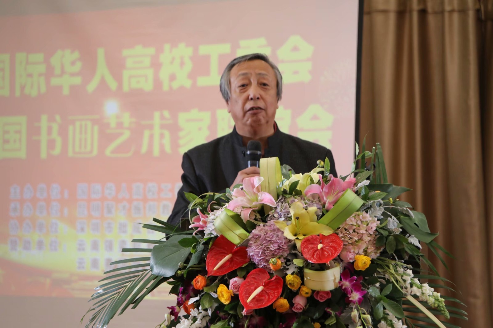 国际华人高校工委会创始人、主席凡人致欢迎辞,代表大会组委会向来自韩、美、日三国的爱国侨胞致以敬意。“在江山如画的多彩云南,才华横溢的艺术家们是发展并推动当代文化发展的生力军。在春意盎然的世博园,祝愿在座的书法家画家美术家艺术家和社会各单位人士妙笔生花,个个翰墨成章,在广交朋友广结良缘的平台上,弘扬中国传统文化,争先启后,继往开来,与时俱进,勾画出中华民族伟大复兴的愿景。”