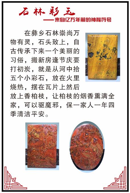 石头是石林最响的一张名片,石头是撒尼文化的魂,在彝乡石林崇尚万物有灵,石头致上的习俗。石林古代土司王爷征战用的战车轴承都是用彩玉磨成圆珠,镶嵌在木轮轴上进行滚动的,王朝兴衰数百年,培育了几代撒尼贵族,他们把彩玉作为财富与尊贵的象征,拉弓搭箭用的扳指变成了指间的戒指,把显示官衔的玉带变成了腰间的勾搭子,把彩玉中的文化艺术推向了极致,成为当时的撒尼贵族配饰品。而以阿诗玛、阿黑哥为代表的撒尼民族文化,以石述史,承载着撒尼人凭借彩玉对美丽、吉祥、幸福的向往。
