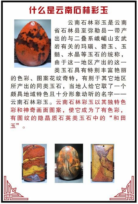 石林彩玉,是石林县至弥勒县一带产出的与二叠系峨嵋山玄武岩有关的玛瑙、碧玉、玉髄等玉石类的统称,由于这一地区产出的这一类玉石具有特别丰富艳丽的色彩、图案花纹漂亮,有别于其它地区所产出的同类玉石,且主要产于石林县境内,当地人给它们取了一个具有强烈地域特色且十分形象动听的名字——石林彩玉。经专家多次考察、考证和检测分析,石林彩玉具有宝石学特征的隐晶质、隐-显微粒状变晶结构的矿物集合体。主要矿物成分和结构构造,不同于我们以往所发现的玉髓和玛瑙,是一个新的玉种。