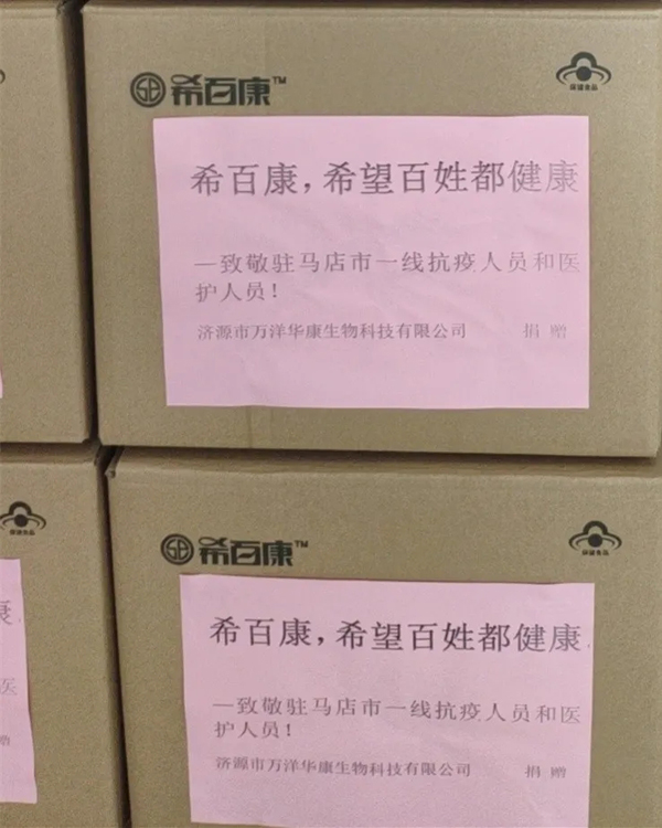 万洋华康公司以“希百康,希望百姓都健康”为初心,在新冠病毒肺炎疫情发生以后高度重视、积极部署,全力参与。该公司首先每日向母公司——万洋集团全体员工发放希百康硒产品用于全员补硒提升免疫力。同时,该公司心系前线医务人员和一线工作者的健康,在第一时间与湖北省和河南省重点疫区取得联系,将原先发往全国药房的希百康产品用于疫情捐赠 。截止目前,已分别向鄂州市、大冶市、天门市、仙桃市等湖北省疫区及郑州市、南阳市、信阳市、驻马店市、安阳市、企业所在地济源市等河南省疫区和陕西省西安市的医护人员、一线抗疫人员共计捐赠57200盒价值1265.94万元希百康系列产品,帮助提高一线抗疫人员身体免疫力。
