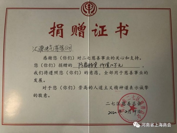 2月19日上午,上海商会副会长、汇源电气有限公司董事长刘兴华一行,在郑州二七区慈善总会相关人员的陪同下来到二七区疫情防控工作指挥部,捐赠了十万元的疫情防控物资。二七区委副书记、常务副区长、区新冠肺炎疫情防控工作领导小组常务副组长姚志伟现场为企业颁发了捐赠证书。