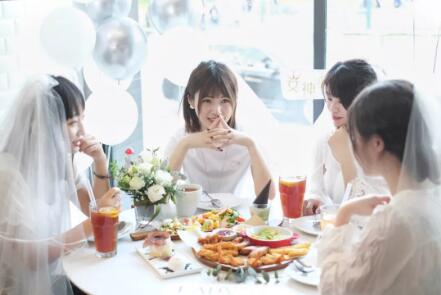 一抬头,看见店里来了几个白衣飘飘的年轻女孩,都是精致的猪猪女孩,她们明快、恣意、青春,戴着头纱,捧着栀子花,笑容清丽又温暖。真是意外的收获。
