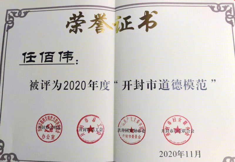 本次组委会授予任佰伟的致敬词是:助人为乐,大爱情深。你们用热情的双手,把一颗火热的爱心送给父老乡亲,把一滴滴鲜红的热血捐献给需要帮助的人。你们是三月的春风,温暖了整个社会,践行了雷锋精神。你们把扶危济困的传统美德发扬光大,把爱的种子播撒在汴梁大地,让八朝古都鲜花盛开、绿树成荫。