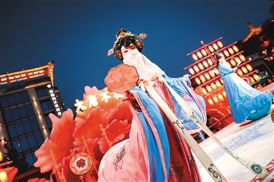 工作人员身着传统服饰在西安步行街大唐不夜城表演。 |