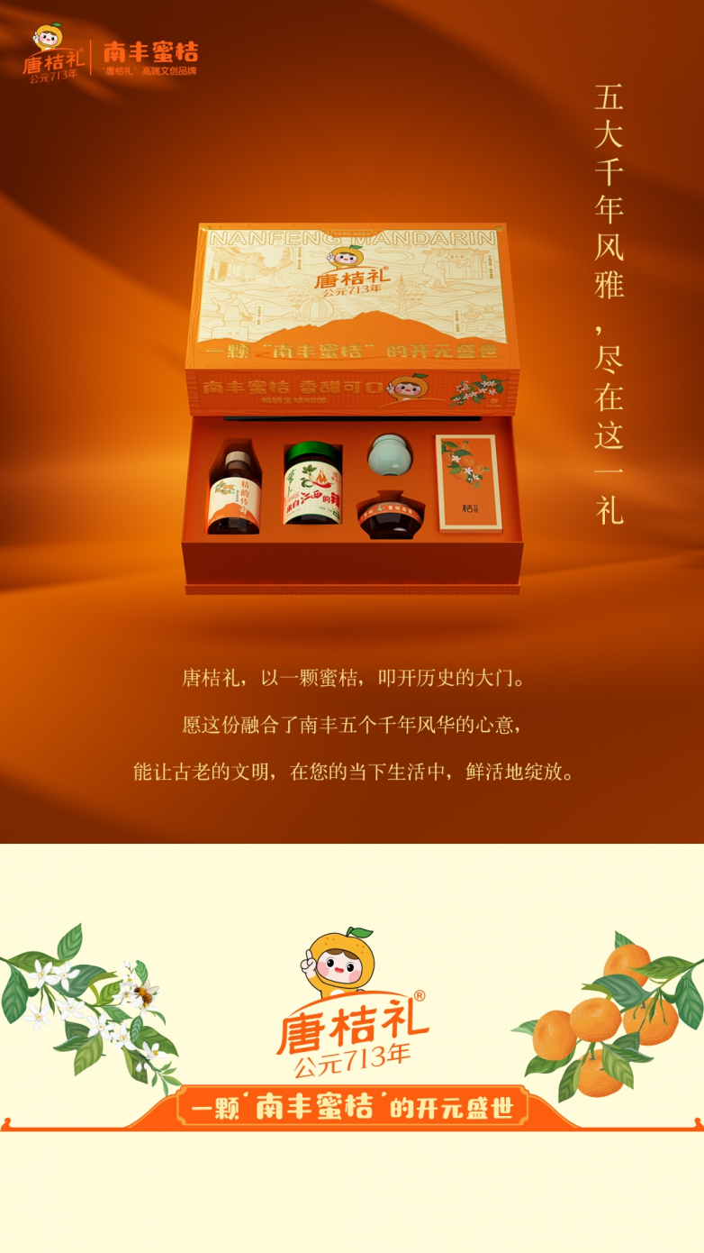 我们以“唐桔礼”为名,采撷“五个千年”的文化精粹,将历史的厚重与风物的甘甜,一同献予这个时代。唐桔礼,一颗“南丰蜜桔”的开元盛世。