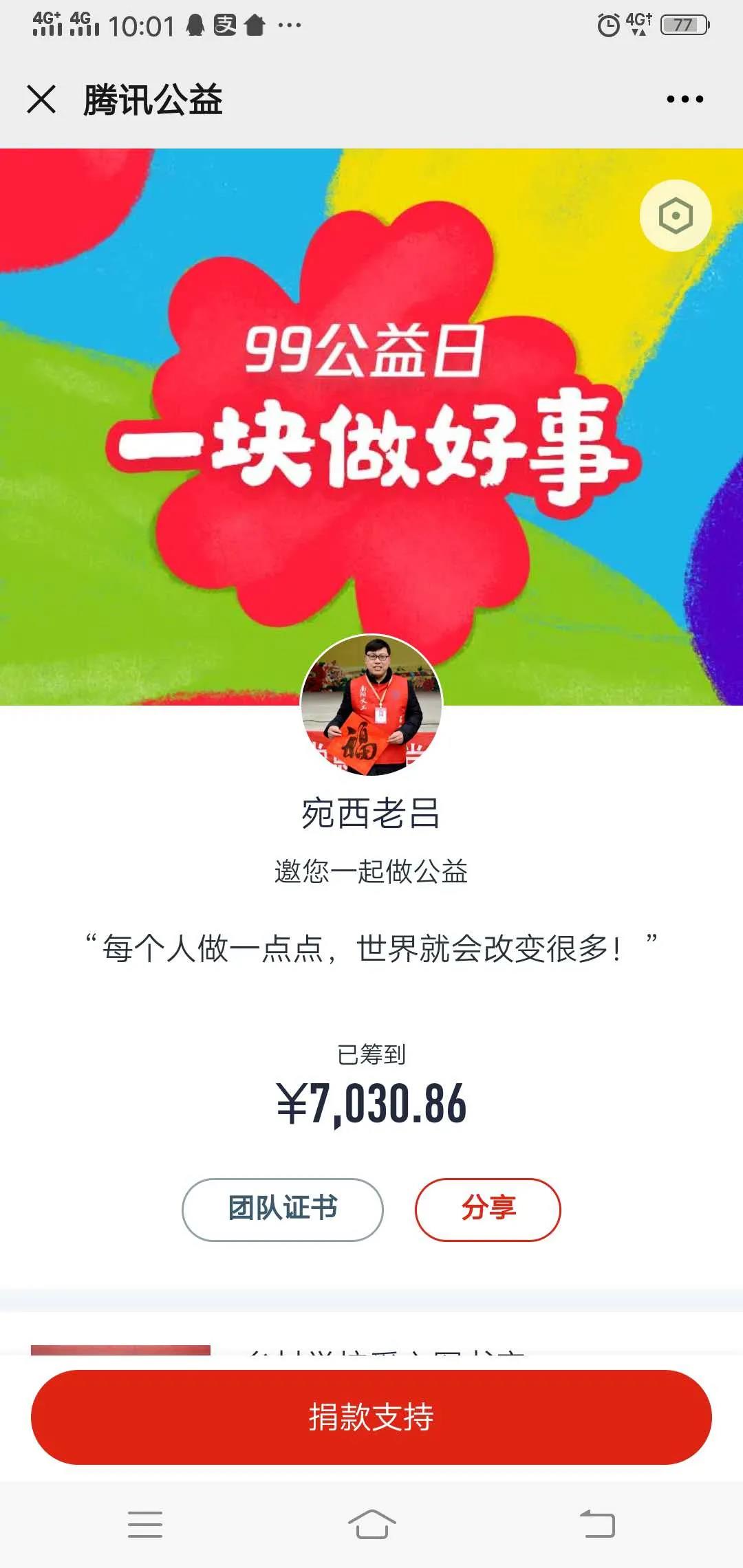南阳义工联在会长和副会长的带领下,在理事群发起倡议,号召大家一起为乡村小学图书室的筹建募捐出一份力,尤其是吕会长、胡泽召副会长、黄素贞副会长、刘兴安副会长、王红伟理事等的带头下,大家纷纷在微信建立微信群,邀请好友在9月7日、8日、9日这三天的上午9点钟,在二维码或链接识别后进行捐款,活动得到了广大爱心人士的大力支持,也为将来乡村学校的爱心图书室筹备添砖加瓦。腾讯公益在每年的99公益日总会拿出巨资支持全国的公益事业,成功的企业家都是把盈利的钱拿出来一部分关爱更多需要帮助需要温暖的人,所以,我们都喜欢这样的爱心企业,也一直都用着他们的产品,比如:QQ、微信等等,同时也改变着国人对企业的看法,一个企业不仅仅只有王者荣耀和和平精英,也不仅仅只模仿和多产业链,更多的还有QQ音乐和微信读书,还有腾讯公益和微信公众号等等众多免费的资源。心有大爱的企业定可以走的更远。