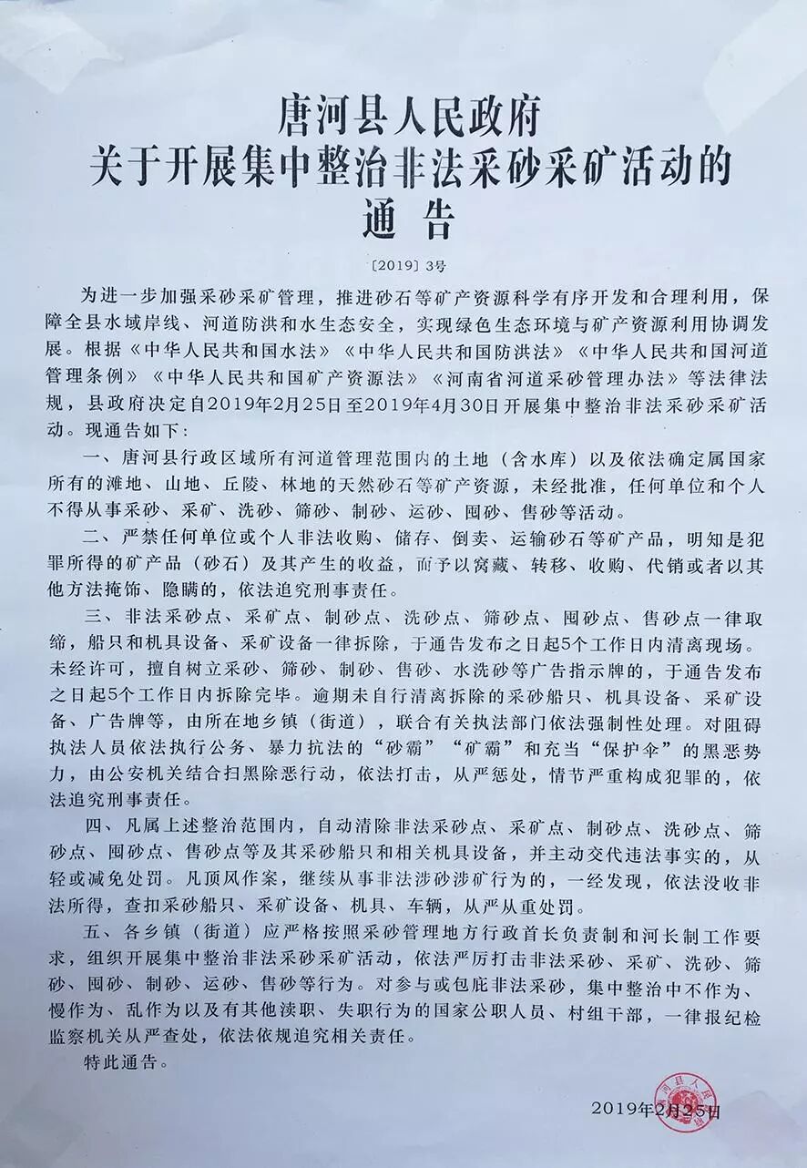 为进一步加强采砂采矿管理,推进砂石等矿产资源科学有序开发和合理利用,保障全县水域岸线、河道防洪和水生态安全,实现绿色生态环境与矿产资源利用协调发展。根据《中华人民共和国水法》《中华人民共和国防洪法》《中华人民共和国河道管理条例》《中华人民共和国矿产资源法》《河南省河道采砂管理办法》等法律法规,县政府决定自2019年2月25日至2019年4月30日开展集中整治非法采砂采矿活动。现通告如下: