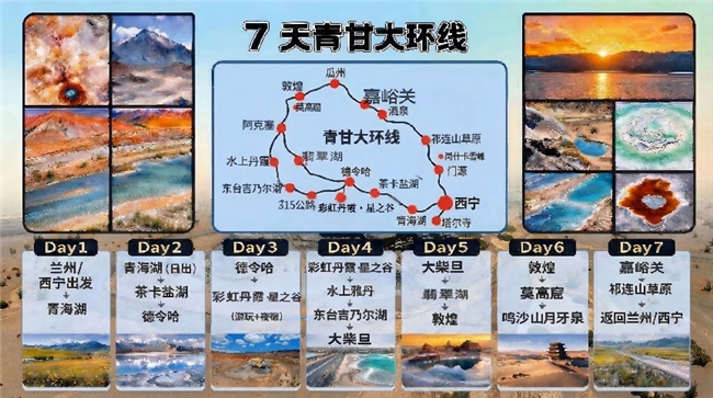 从兰州或西宁出发,沿着这条路线向西行驶,可以依次经过青海湖、彩虹丹霞·星之谷、柴达木盆地、敦煌沙漠以及祁连山草原等地。